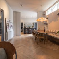 Zeer verrassend en grote woning in Bussum aan het Singel. De wanden zijn in diverse verfsoorten in de kleur Palladio van Carte Colori gezet. Alle houtwerk / trappenhuis in de kleur Ebano vloerverf en zijdematlak. Op de heerlijke bank in stoere canvasstof liggen prachtige kussens in stoffen van Fabricut.